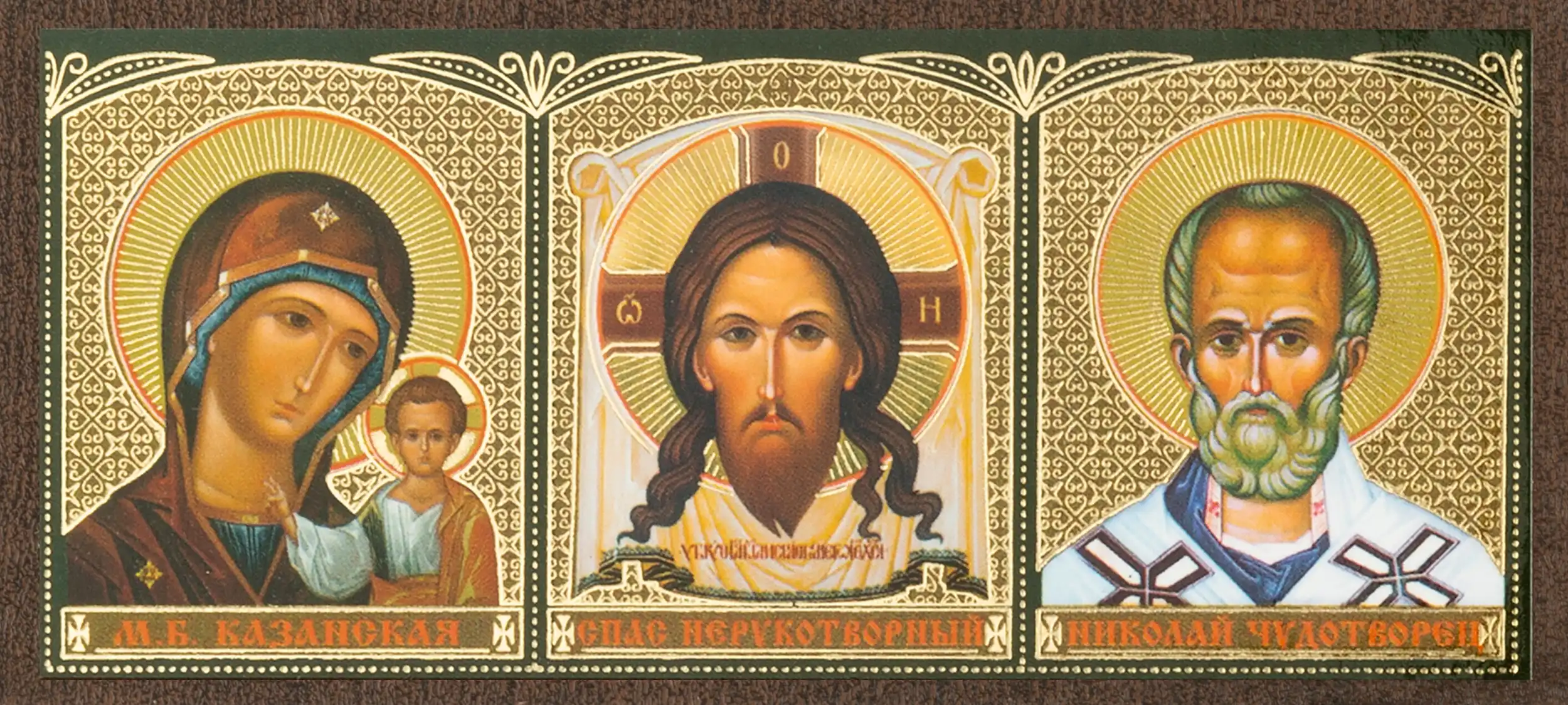 Автоикона "Казанская БМ, Спас Нерукотворный, Николай Чудотворец", зеленый, 4,5х10 на МДФ