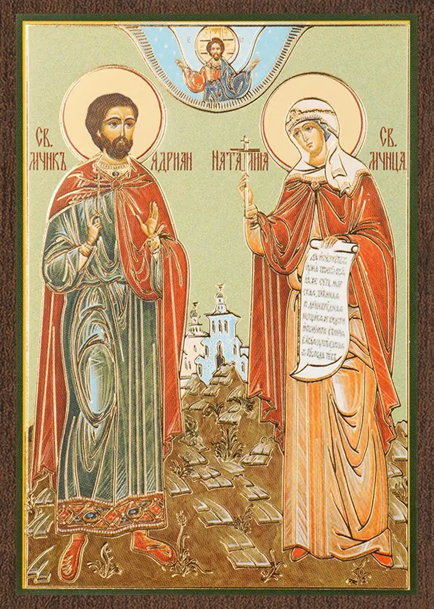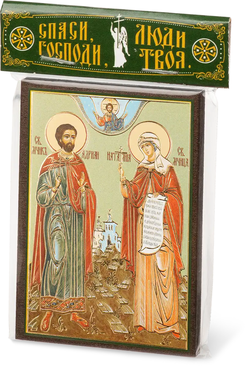 Икона "Адриан и Наталия" 6х9 на МДФ-6 (зеленый фон)