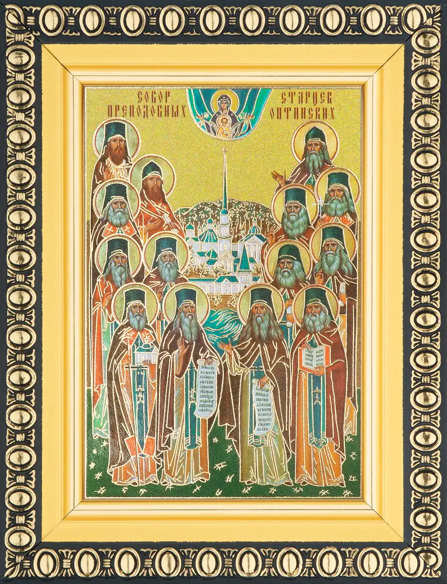 Икона "Собор Оптинских старцев" 6х9 в раме 8х11