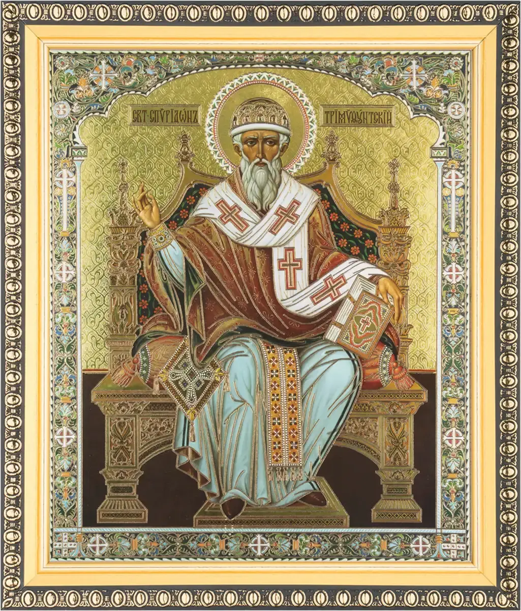 Икона "Спиридон Тримифунтский" на троне 15х18 в раме 18х21